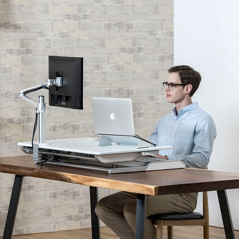 置き型タイプの多機能双画面対応アームで、ノートパソコンとモニターを快適に設置できます。