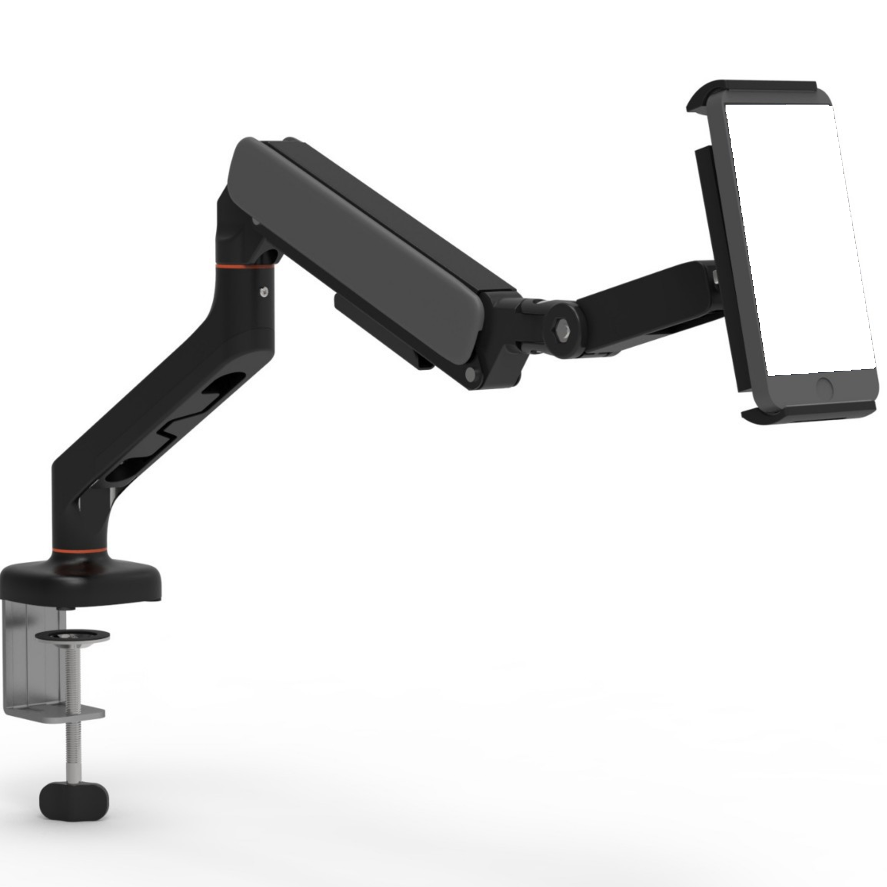 携帯端末や小型情報端末を固定できるモニターアームタイプの機構で、デスクに簡単に取り付けられるクランプ式を採用しています。