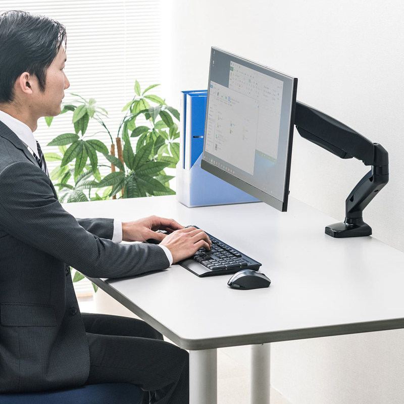 机に挟んで固定できる置き型のモニターアームです。 多関節構造により画面の高さや角度を自由に調整でき、快適な作業環境を実現します。 机上空間を有効活用しながら画面位置を最適化できるため、長時間作業でも疲れにくく姿勢改善にも貢献します。 挟み込み式の台座で簡単に設置でき、工具不要で取り付けが可能です。 業務用途から在宅勤務まで幅広く対応するモニターアームとして最適な一品です。