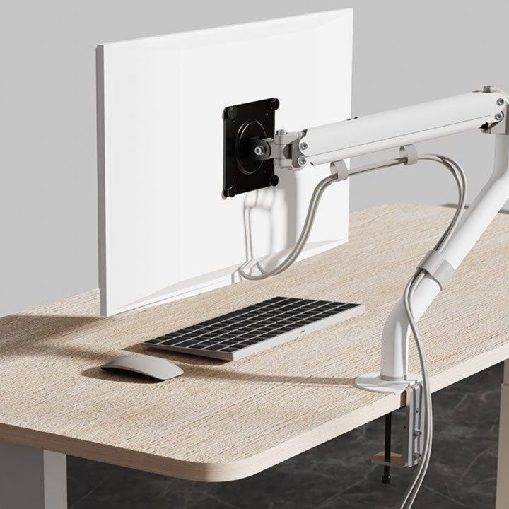 滑らかな曲線を描くアーム部分が美しい置き型のモニターアームです。 机の天板に固定するクランプ式で安定感抜群、画面の高さや角度を自由に調整できます。 人間工学に基づいた設計により最適な視線の位置を実現し長時間の作業でも疲れにくい環境を提供します。 省スペース設計で机上を広々と使えデスク周りをすっきり整理できる実用的なモニターアームです。