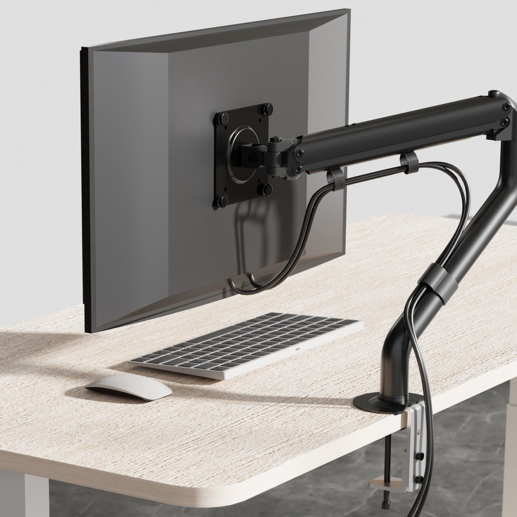 省スペース設計で机上を広々と使えデスク周りをすっきり整理できる実用的なモニターアームです。